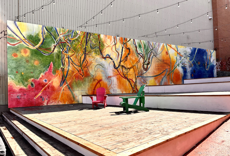 " Il y a très longtemps serpentaient ici des glaciers, un fleuve, des vignes comme des lianes, des célébrations en canot. Je me rappelle des gens en amour sous les arcs-en-ciel; ici serpentait une rue, et fourmillaient les embouteillages, et zigzaguaient les allers-retours obstinés au long des trottoirs, comme les gestes d’un.e tisserand.e mûrissant un tissu social émaillé de paroles et de pas. Il y a très longtemps serpentaient ici les racines d’un ciel comme une échelle. Ces racines puisaient derrière les portes; au creux des cœurs, des têtes et des mains, là où se lovent les rêves. "