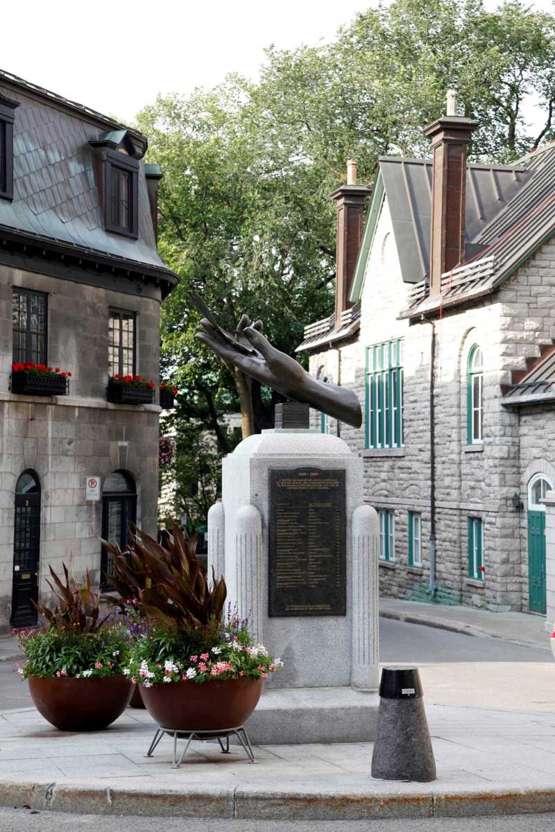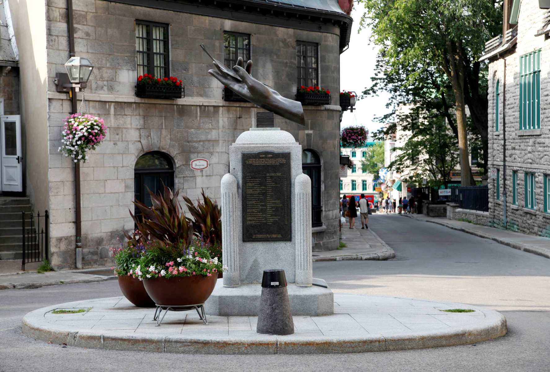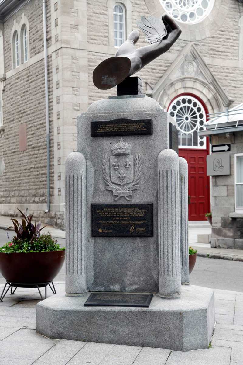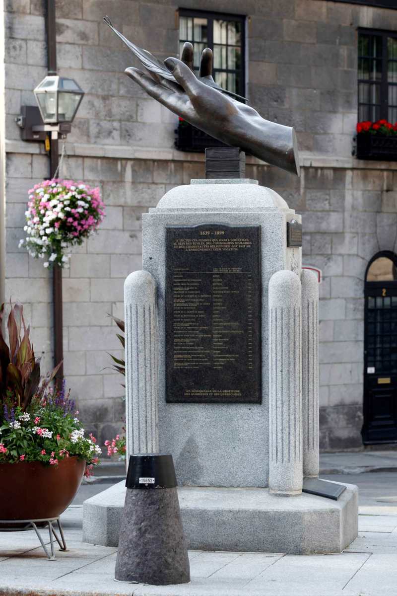 Une main posée en porte-à-faux sur une pile de livres symbolise l’apport des communautés de femmes enseignantes à la construction de la colonie. L’œuvre souligne également le 325e anniversaire de la mort de Marie de l’Incarnation, fondatrice du monastère des Ursulines de Québec et de la première école pour filles en Amérique du Nord, en 1639.