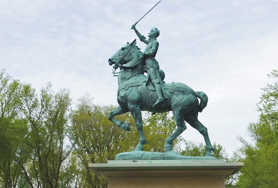 Cette statue équestre a été offerte par l’artiste, d’origine new-yorkaise, en hommage aux soldats morts lors des batailles des Plaines d’Abraham et de Sainte-Foy en 1759 et 1760. Jeanne d’Arc, revêtue d’une armure, visière relevée, brandit son sabre en signe de ralliement des troupes.