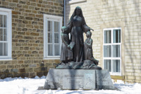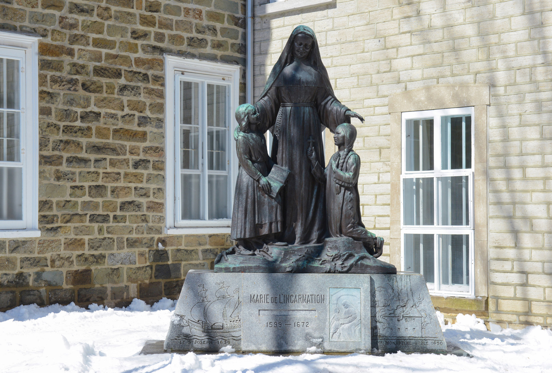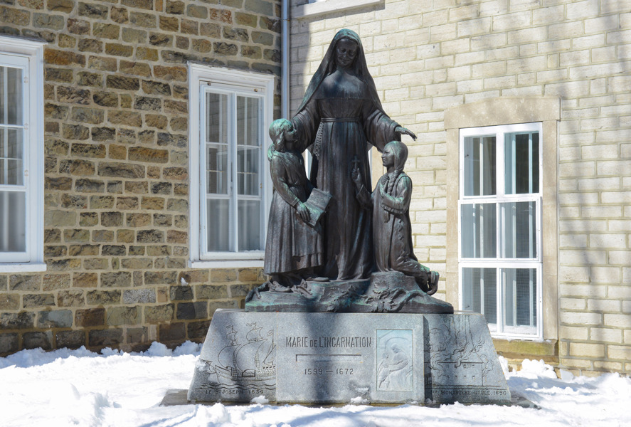 Fondatrice du couvent des Ursulines de Québec en 1639, Mère Marie de l’Incarnation, née Marie Guyart, figure entre deux écolières, l’une canadienne, l’autre amérindienne. Au centre du socle, un bas-relief la représente faisant ses adieux à son fils au moment où elle quitte la France. De part et d’autre, le voilier le Saint-Joseph et le premier couvent, incendié en 1650.