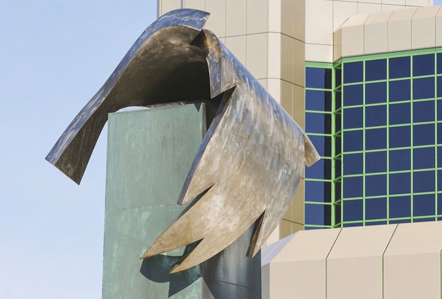 Une feuille recourbée en acier poli, qui rappelle aussi une flamme, enveloppe le sommet d’un imposant socle aux lignes épurées. La sculpture très architecturée allie différentes finitions pour mieux accrocher la lumière.