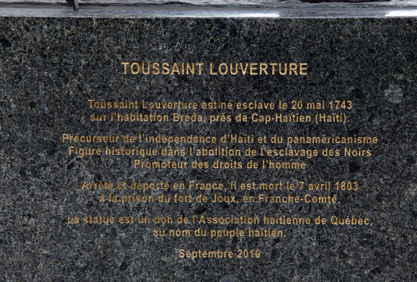 Dévoilée le 8 septembre 2010, cette sculpture de bronze a été offerte à la capitale du Québec par l’Association haïtienne de Québec. Elle rappelle l’homme politique et général haïtien François-Dominique Toussaint Louverture, qui fut le plus grand dirigeant de la Révolution haïtienne avant de devenir gouverneur de Saint-Domingue.