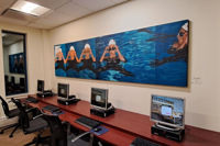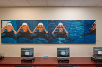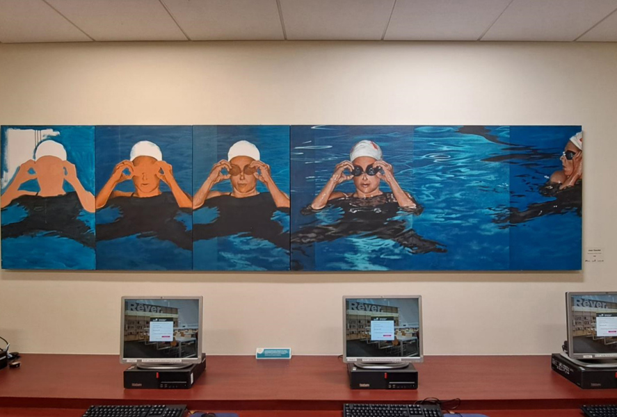 L’œuvre présente une nageuse qui ajuste ses lunettes protectrices pour mieux voir le public qui l’observe, public qui se trouve surpris d’être observé en retour. La peinture offre ainsi un jeu de croisements de regards en mettant face à face des protagonistes qui s’adonnent à une activité de détente (la nage et la lecture).