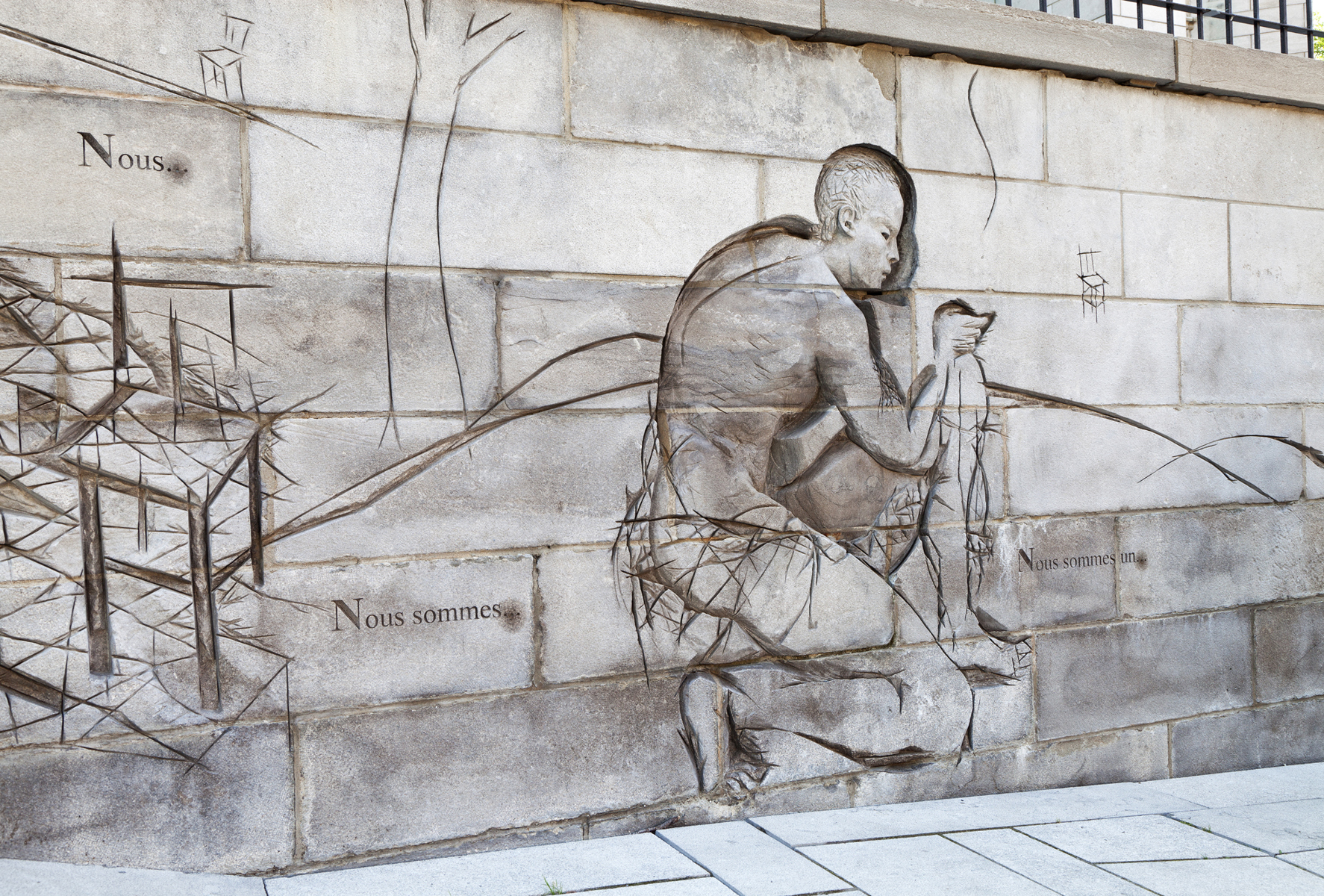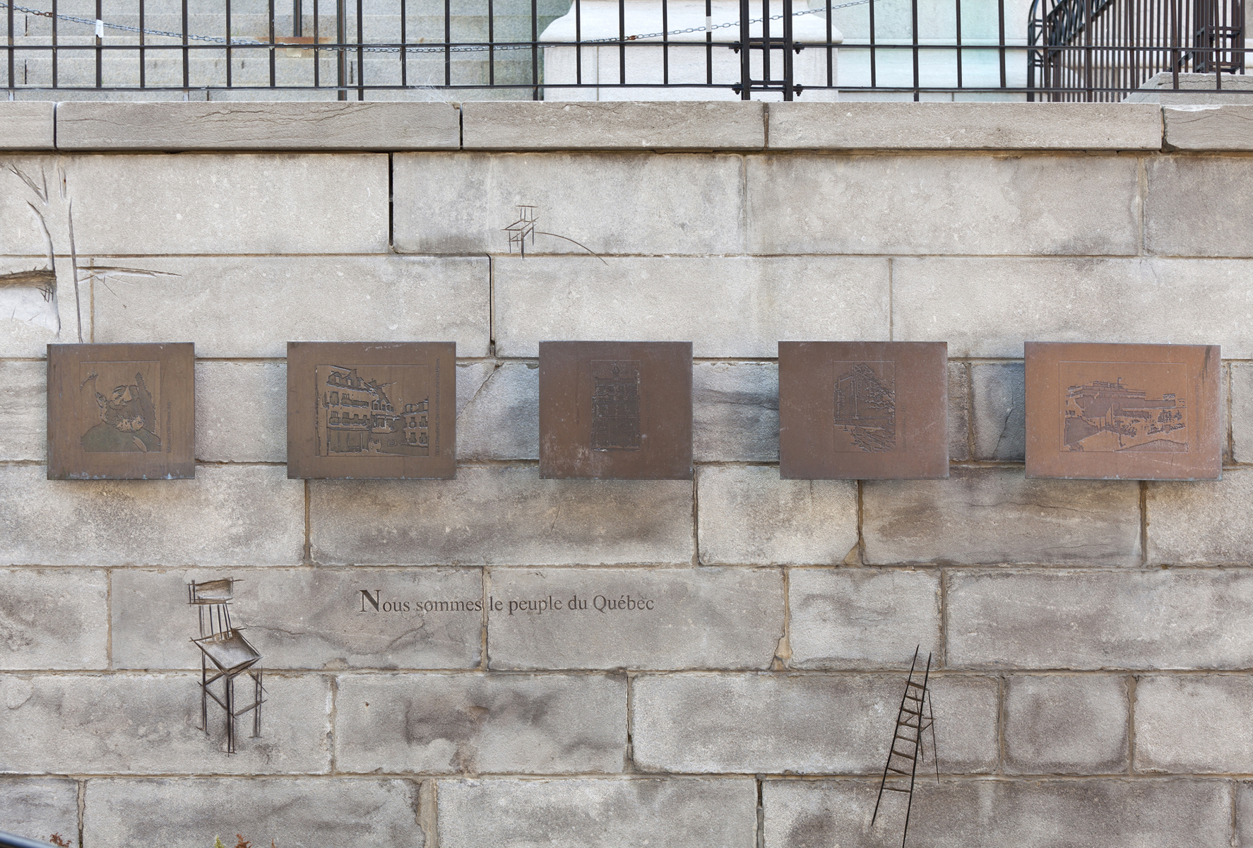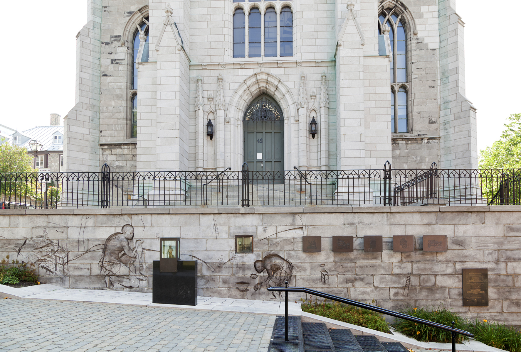 Gravée sur un mur de pierre, une inscription donne le titre de cette œuvre sculpturale qui comprend un bas-relief sur pierre, deux bronzes et cinq plaques de laiton gravées. Celles-ci retracent l’histoire de l’Institut Canadien, organisme voué à la promotion de la culture québécoise qui célébrait en 1998 ses 150 ans d’existence.