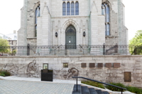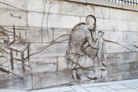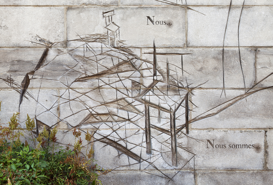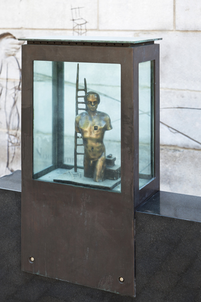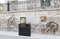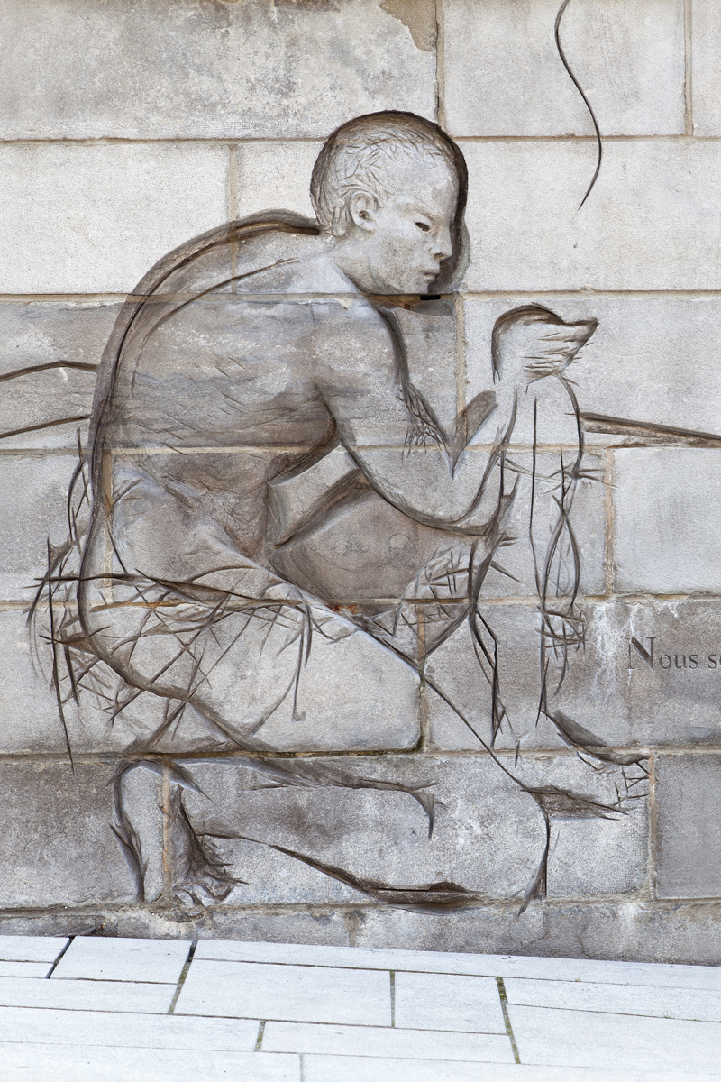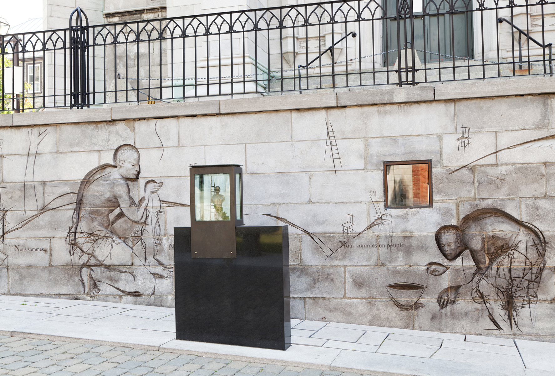 Gravée sur un mur de pierre, une inscription donne le titre de cette œuvre sculpturale qui comprend un bas-relief sur pierre, deux bronzes et cinq plaques de laiton gravées. Celles-ci retracent l’histoire de l’Institut Canadien, organisme voué à la promotion de la culture québécoise qui célébrait en 1998 ses 150 ans d’existence.