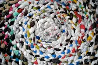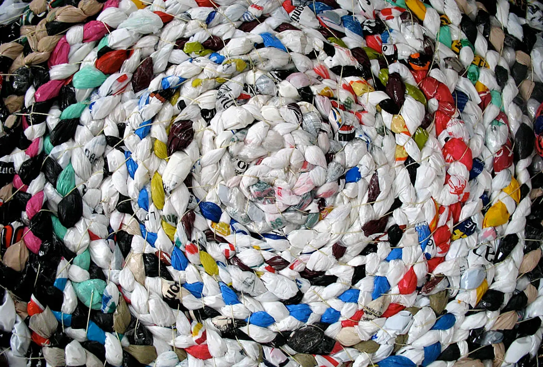 Une longue tresse faite de sacs de plastique est enroulée sur elle-même pour former un immense tapis, semblable à ceux qui ornaient les maisons autrefois. L’artiste a réalisé cette œuvre sur une période de huit ans avec l’aide de dizaines de personnes rencontrées un peu partout au Québec.