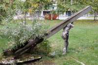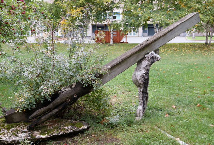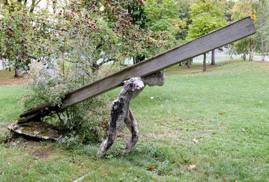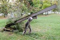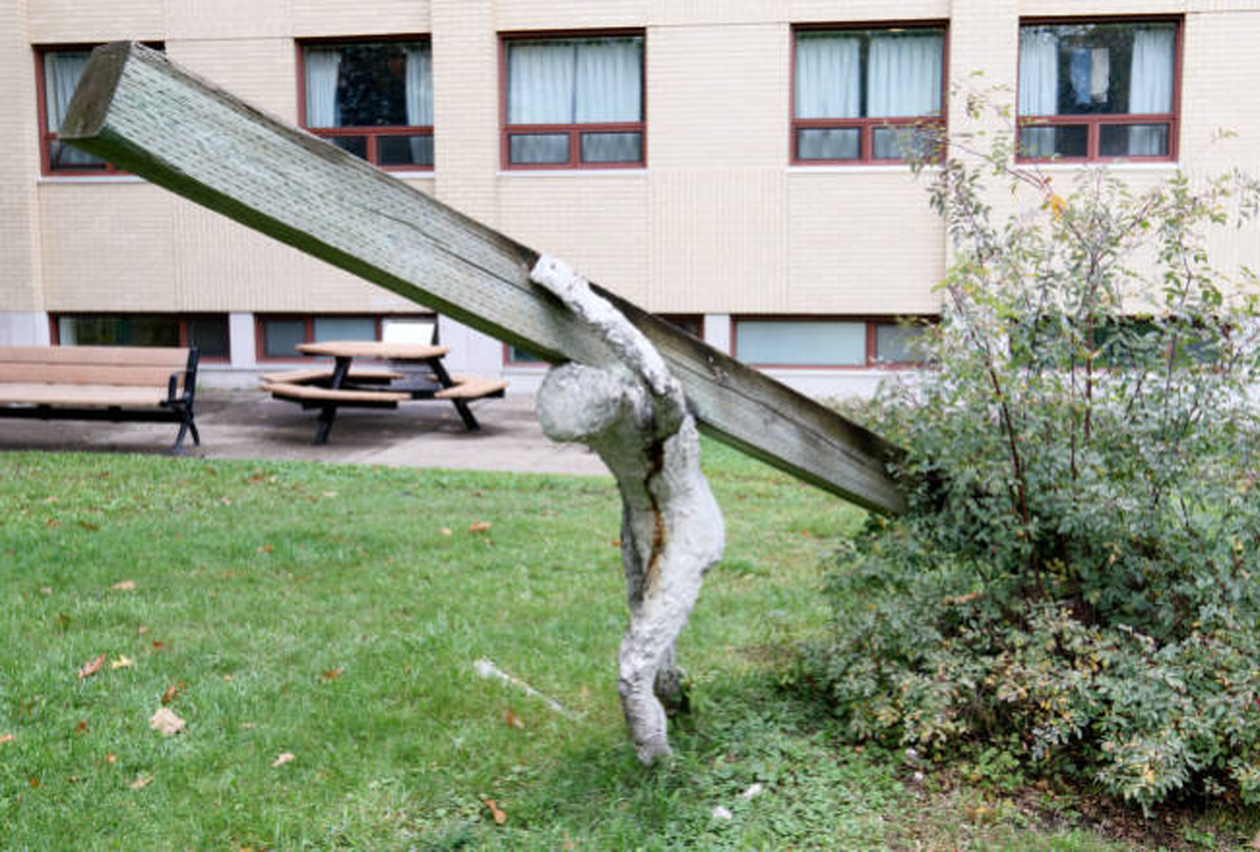 Sculpture réalisée dans le cadre de l'événement sculpturel Enformances... ou les 120 heures, tenu du 22 au 27 juillet 1987. Un personnage fait d'une structure d'acier et de béton à peine coloré transporte une poutre qui l'écrase. La poutre se transforme elle-même, à sa queue, en corps flottant. De grandeur nature, la sculpture rejoint la thématique de Stations à Montréal -le chemin de la croix-, mais empreinte de labeur plus que d'artifices. Sculpture qui force un contact esthétique remarquable, près de la fontaine entre les pavillons Biermans-Moreau et Pollack. (Source : Durand, Guy. - Du Fleuve à la rue... Saint-Laurent. - Inter : art actuel, no 37, 1987, page 47)