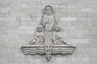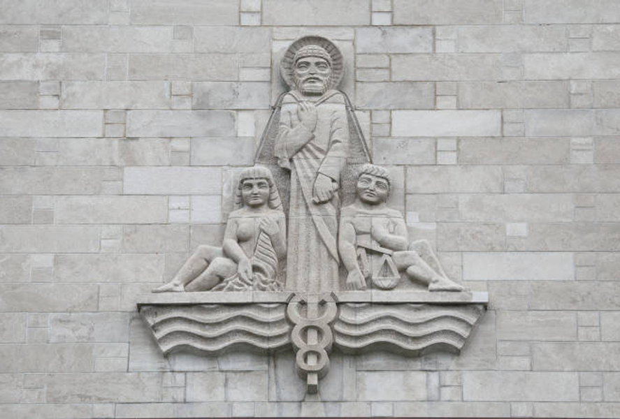 La sculpture représente, au centre, Saint Matthieu, patron chrétien des administrateurs: percepteurs, banquiers, changeurs et comptables. Saint Matthieu était un publicain (percepteur des impôts) employé au péage d'Hérode situé dans la ville de Capharnaüm en Galilée.