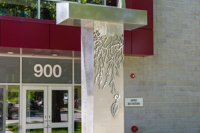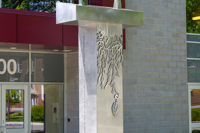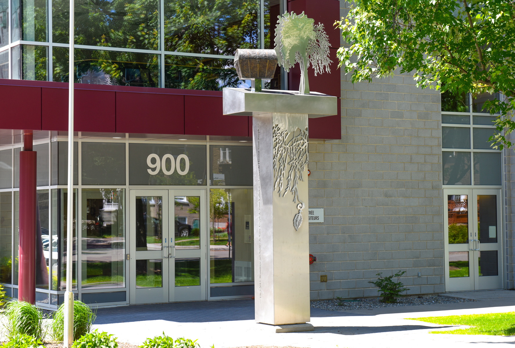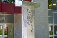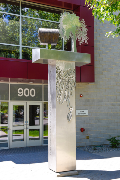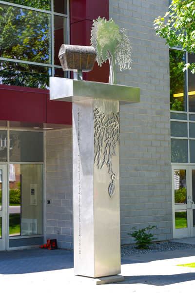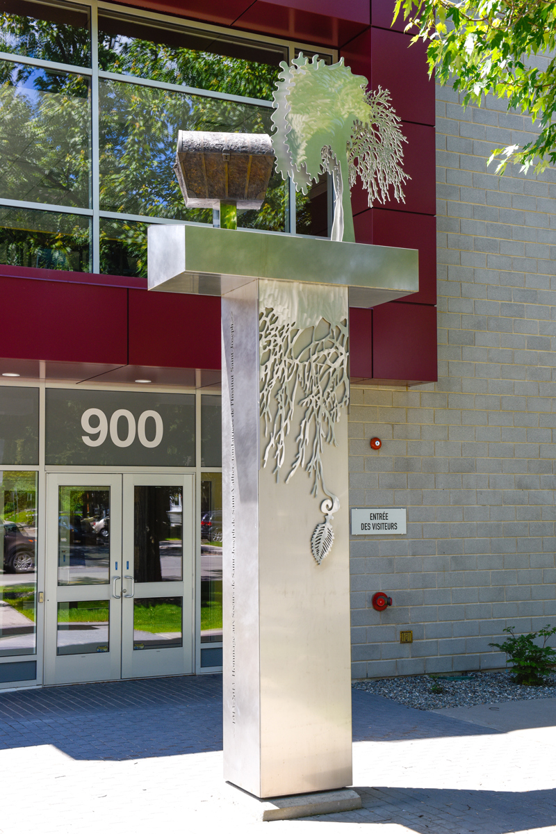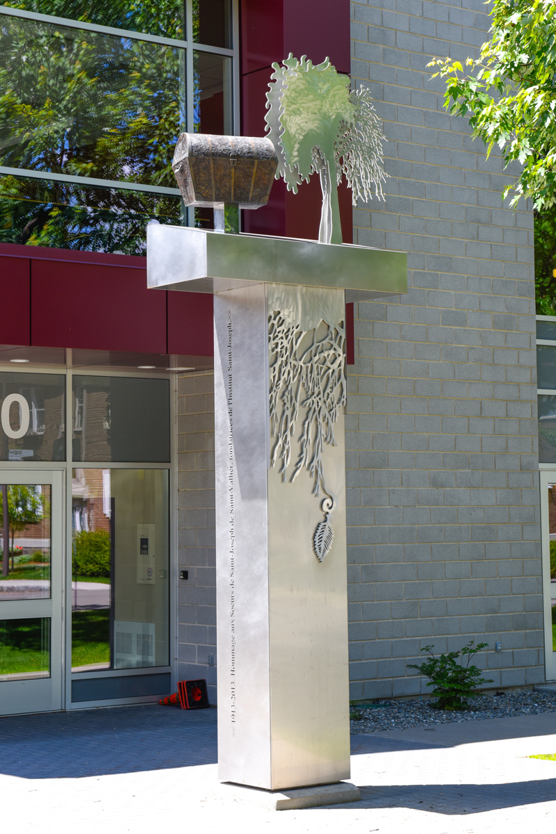Cette sculpture a été réalisée pour les cent ans de l’institut Saint-Joseph, fondé par les Sœurs de Saint-Joseph de Saint-Vallier en 1913. Elle prend la forme d’un pupitre surmontant un pilier, symbole de la pérennité de la congrégation née en France en 1650. Coffre de voyage, motif de dentelle, sabots rappellent le quotidien des religieuses, tandis que l’arbre incarne la croissance et la transmission des savoirs.