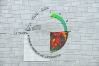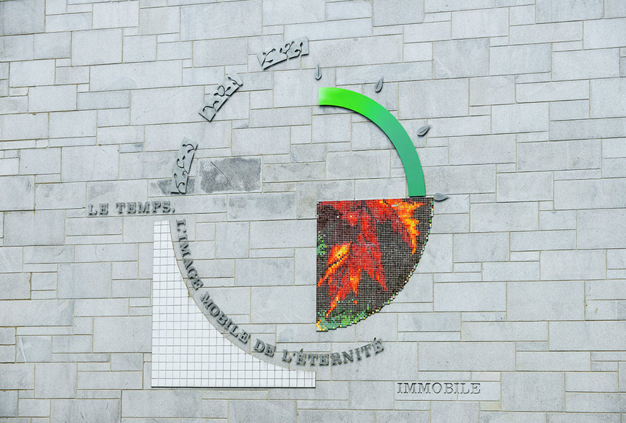Différents matériaux et couleurs s’agencent dans cette œuvre murale pour illustrer la course du temps et le cycle des saisons. Des lettres taillées dans le métal et gravées dans la pierre composent une phrase de Platon.