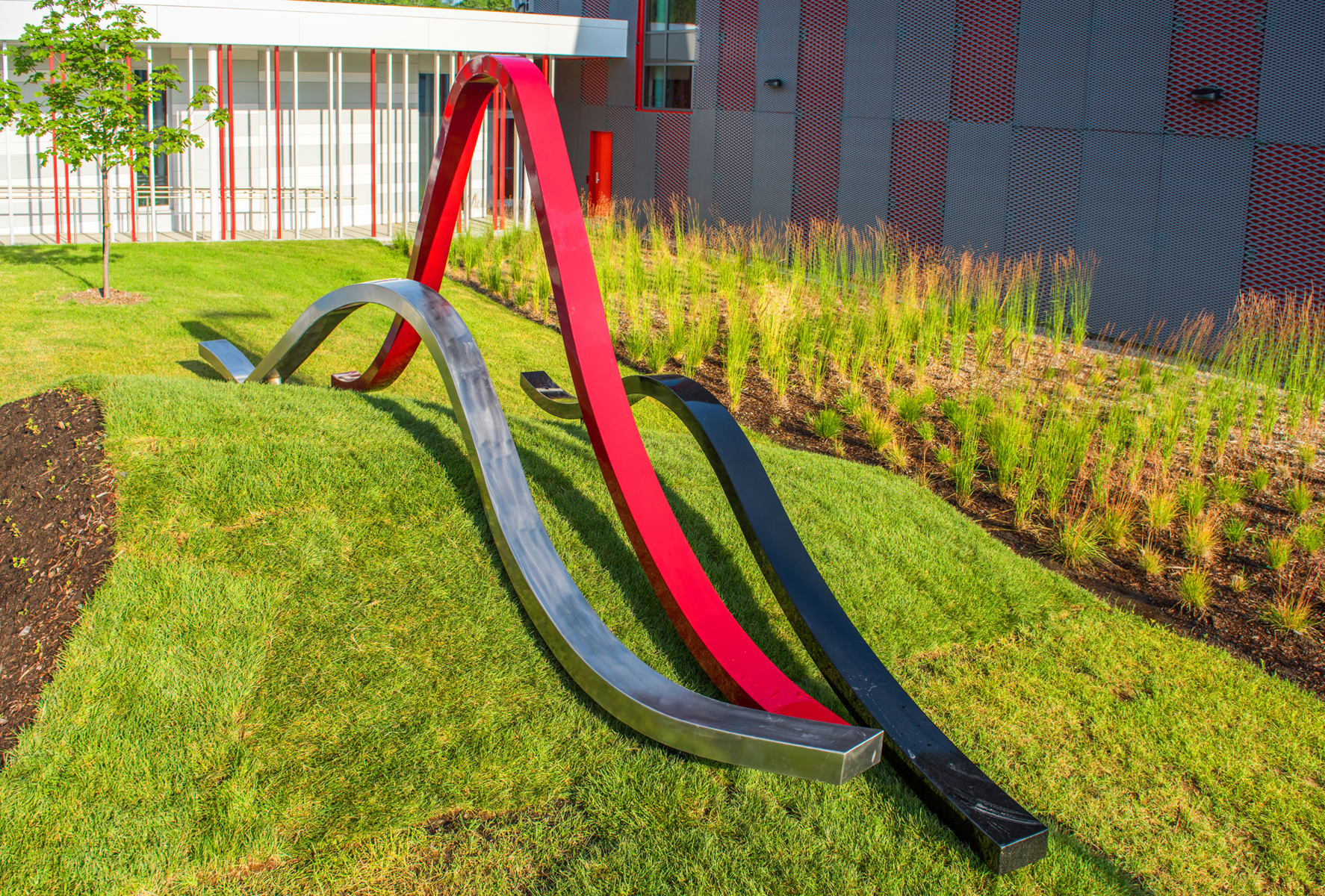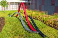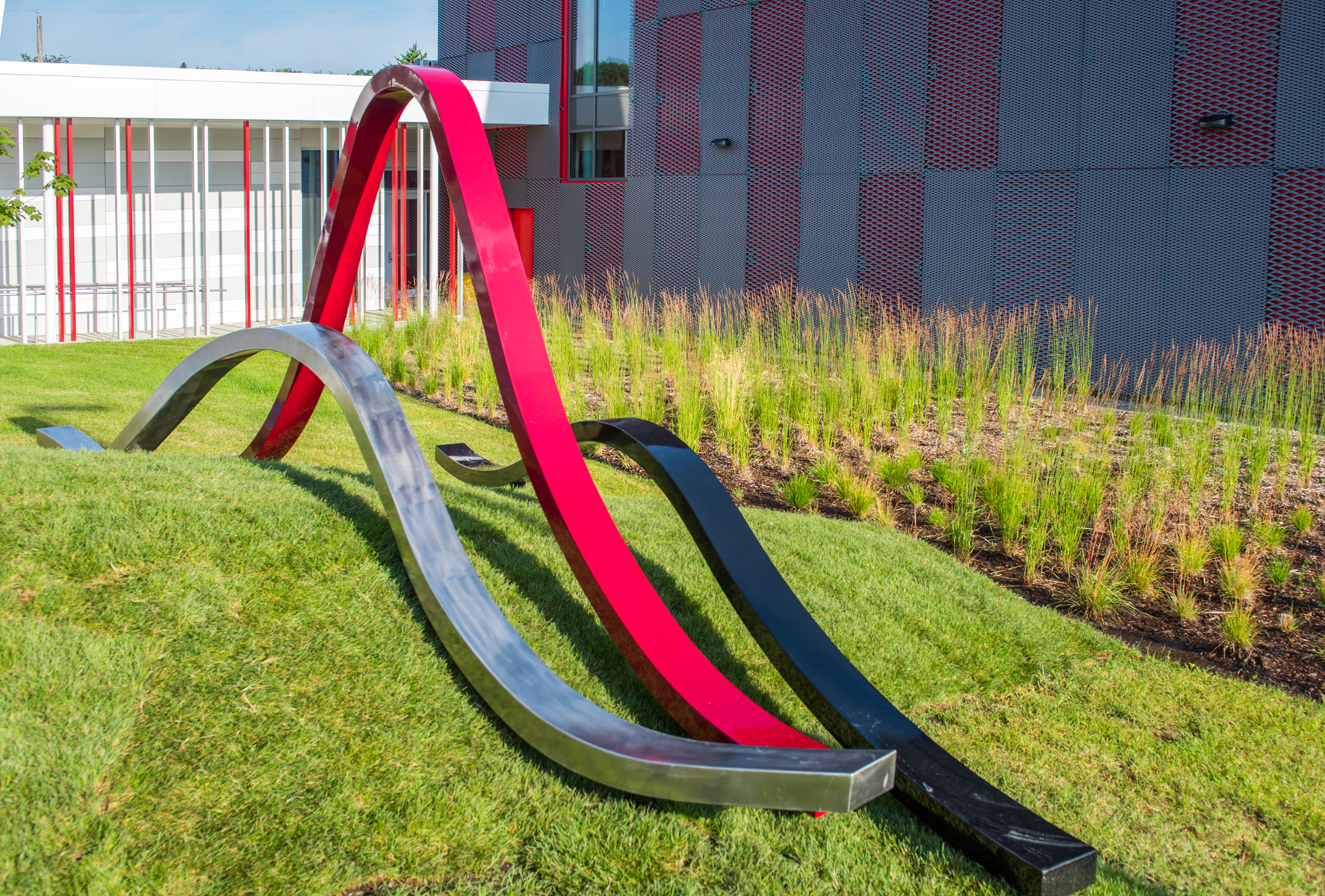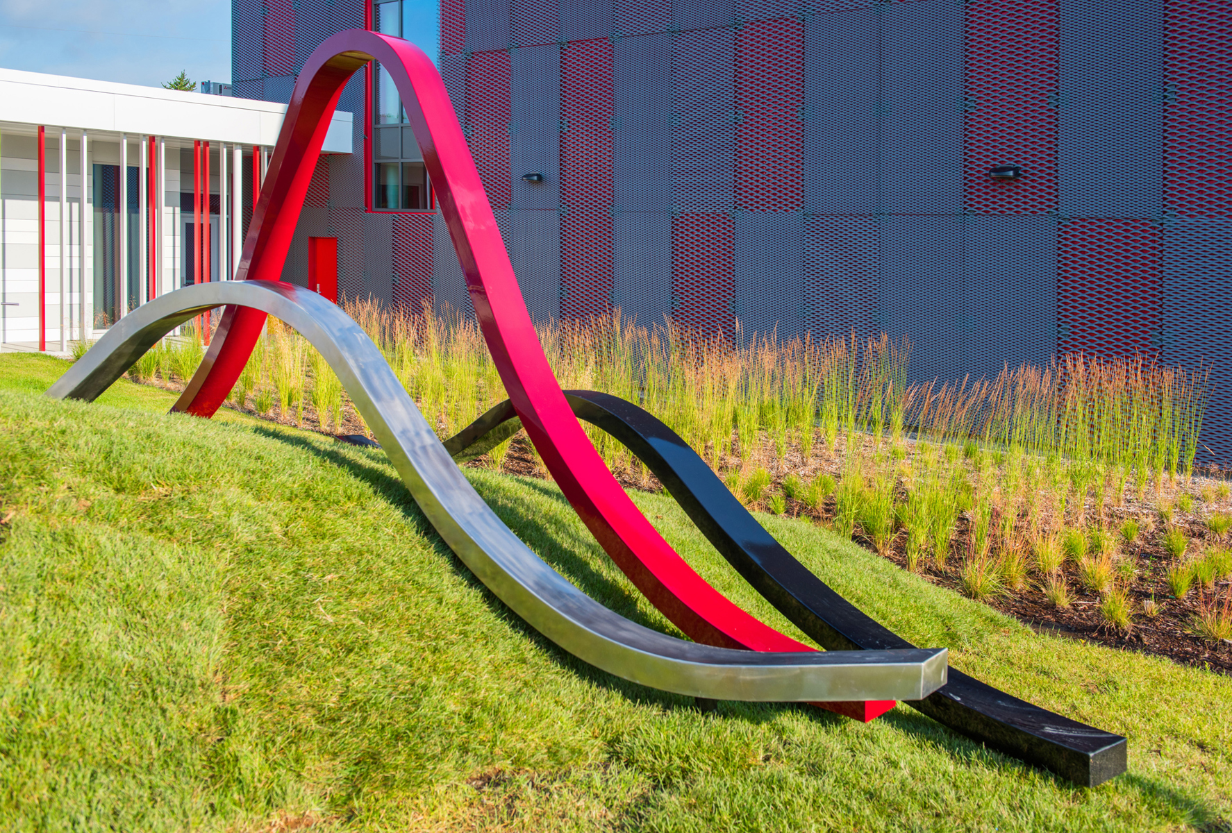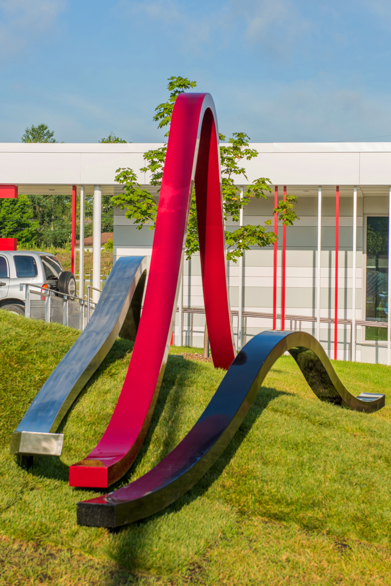Trois ondes de métal propulsées par leur propre élan chevauchent les vagues d’un terrain irrégulier, tels des fils qui tissent un motif raccommodant le paysage. Leur rythme déphasé reflète l’idée d’action/réaction liée au travail des pompiers, qui doivent faire face aux situations les plus inattendues.