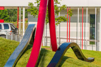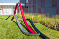 Par sa simplicité, sa faible hauteur et ses lignes courbes, la sculpture fait corps avec l’environnement tout en contrastant avec la façade de l’édifice. Selon l’angle où on l’observe, elle offre différentes perspectives et semble animée d’un mouvement perpétuel.