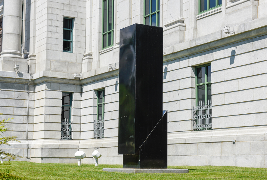 La pureté des formes géométriques crée dans l’espace des jeux harmonieux de tension et d’équilibre. Cette sculpture est l’illustration éloquente d’une dualité : la stabilité des axes verticaux, opposée à l’effet de glissement, de déséquilibre, suggéré par la découpe en diagonale dans le corps monolithique.