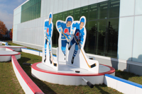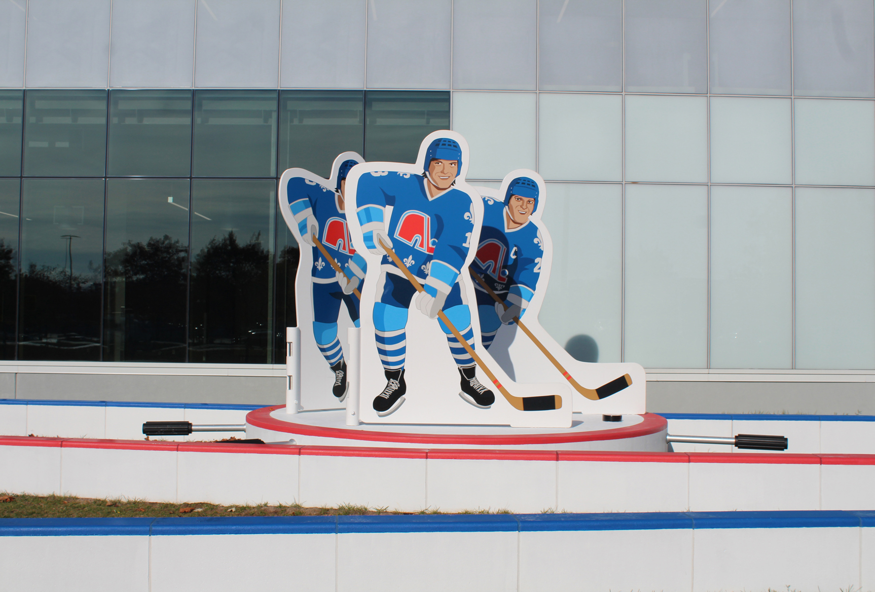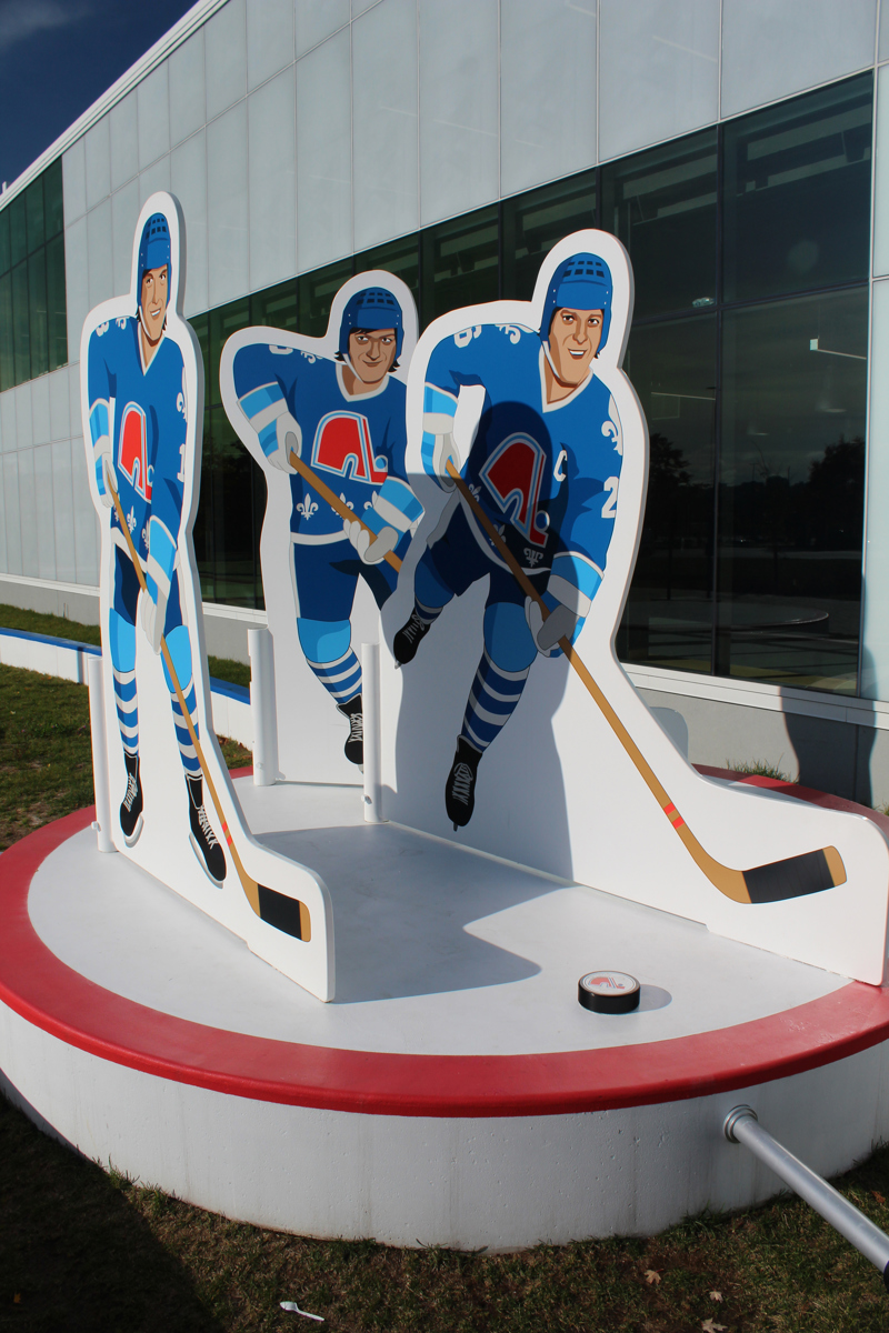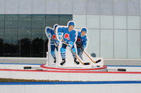 Issus du quartier Saint-Sauveur à Québec, les artistes Pierre Brassard et Marie-Pier Lebeau forment le collectif Pierre&Marie. Ils privilégient les œuvres qui rapprochent l’art du public en abordant de manière ludique différents thèmes sociaux et économiques. Dans Toucher la cible, ils présentent notre sport national comme un phénomène culturel. Les frères Stastny sont mis en scène au milieu d’un jeu de hockey sur table, un divertissement populaire dans les années 1980, à l’époque de gloire du trio. Marian, Peter et Anton y évoluent dans leur position usuelle : ailier droit, centre et ailier gauche.