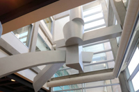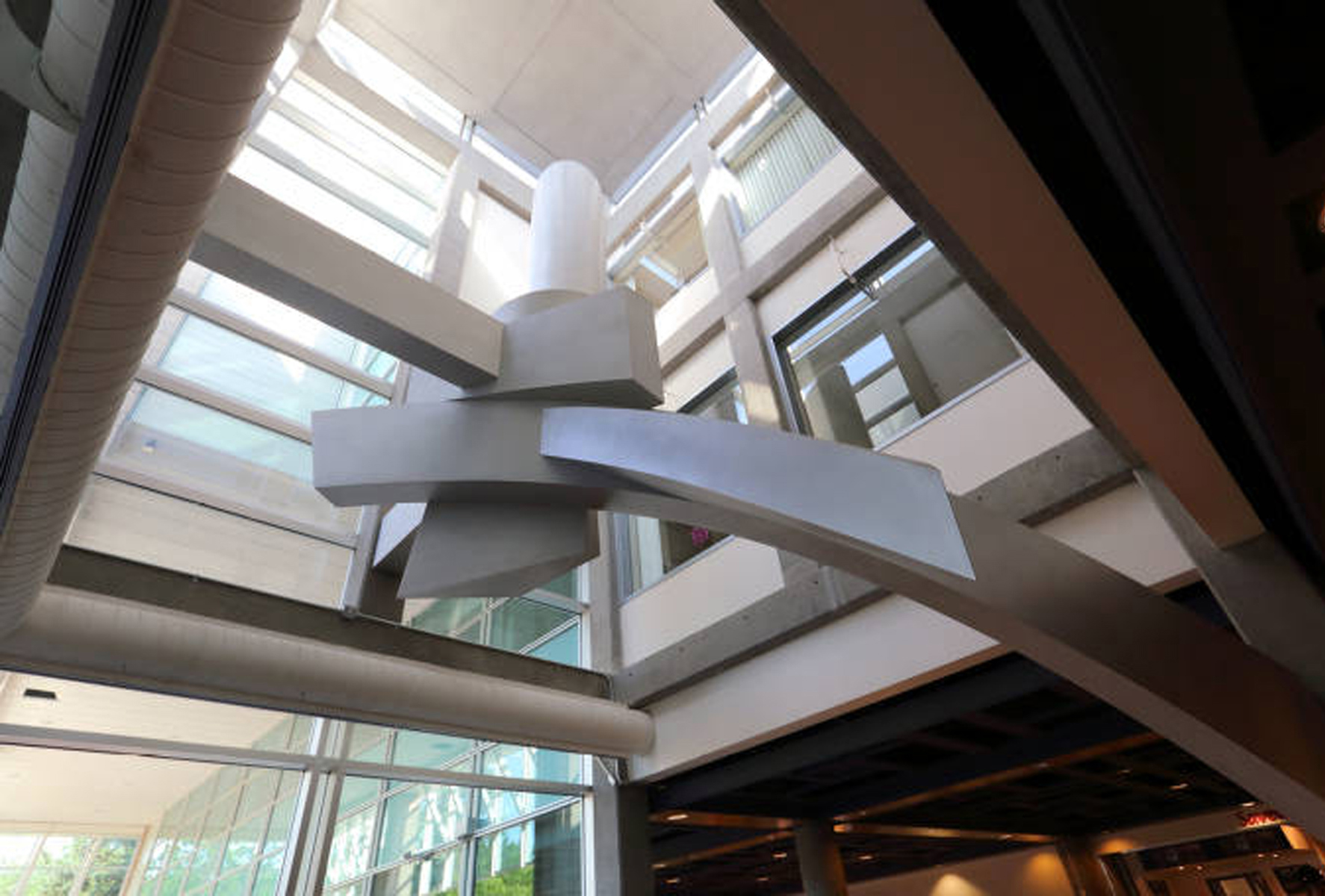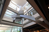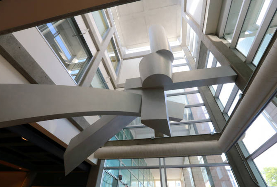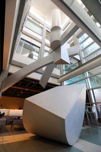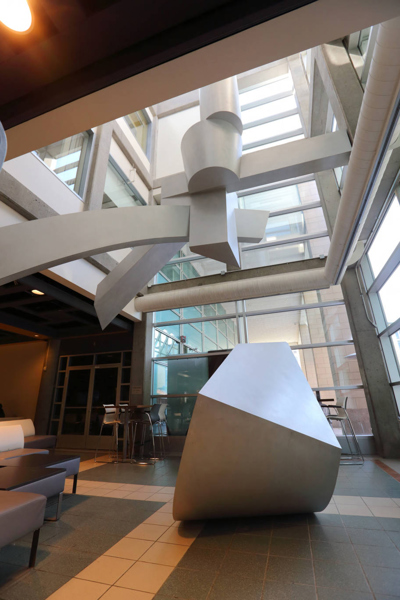 Les formes qui occupent le premier étage sont faites de courbes irrégulières. Elles évoquent l'énergie vitale de l'activité humaine et l'élan créateur. Les formes du deuxième étage sont rigoureusement géométriques. Elles donnent l'impression d'équilibre et de force ascensionnelle. Le cylindre tronqué au sommet de la sculpture rappelle l'un des piliers du patio situé près de la terrasse, à l'angle sud du puits de lumière. L'élément au sol résume à lui seul les composantes de l'organisation spatiale et présente tous les indices de son développement: la spirale, les directions verticales et obliques, l'orientation géographique et l'opposition entre plans droits et plans courbes. Il permet de réaliser le passage entre l'échelle humaine et l'échelle monumentale en suggérant, par ses dimensions un rapport avec la morphologie humaine et, par sa configuration, un enchaînement avec l'autre partie de l'œuvre.